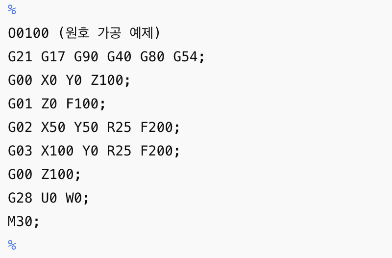예를 들어 다음은 간단한 원호 가공 후 복귀 프로그램이다.